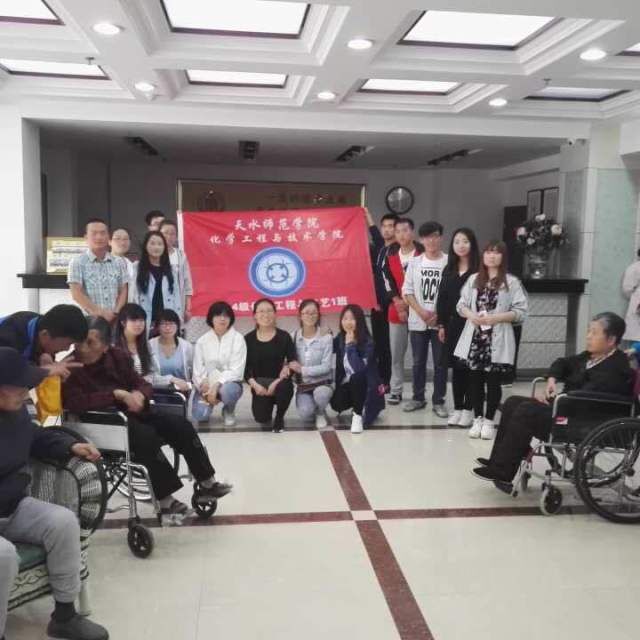 2016年5月21日,14级化工班和15级地理班全体志愿者前往天水市老年护理院,举行了敬老院献爱心活动,为敬老院的老人带去一丝欢乐。此次活动在各班班主任的支持与指导下,由班委会组织,经过两个多星期的精心策划与准备,取得了圆满成功,获得了敬老院老人的一致好评。