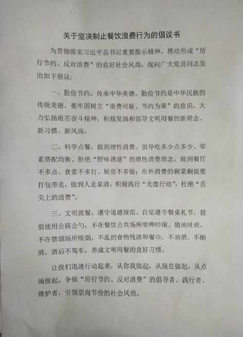 党支部书记组织全体党员学习了习近平总书记关于制止餐饮浪费行为的重要指示。习近平总书记一直高度重视国家粮食安全,提倡“厉行节约、反对浪费”的社会风尚,多次强调要制止餐饮浪费行为,要求以刚性的制度约束、严格的制度执行、强有力的监督检查、严厉的惩戒机制,切实遏制公款消费中的各种违规违纪违法现象。习近平总书记的一系列重要指示批示充分体现了中国共产党居安思危的忧患意识,艰苦奋斗、勤俭建国的优良传统和中华民族的传统美德,表明了党中央厉行勤俭节约、反对铺张浪费的鲜明态度和坚定决心。