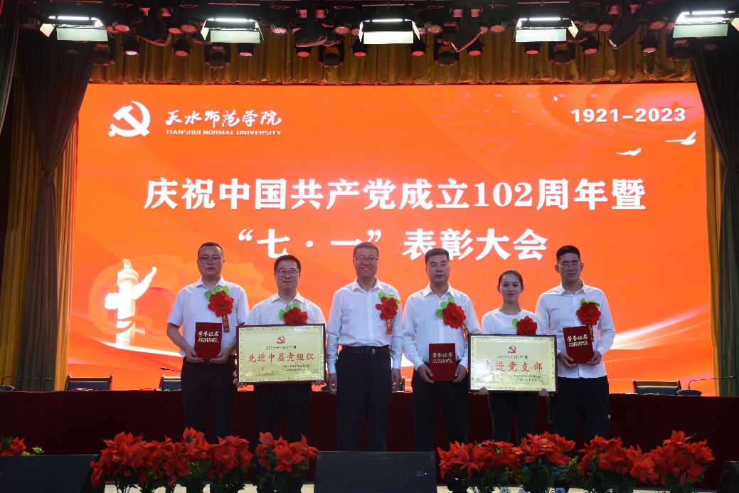 为推动学习贯彻习近平新时代中国特色社会主义思想主题教育和“三抓三促”行动走深走实,充分发挥先进典型、模范师生的示范引领作用和基层党组织战斗堡垒作用,激励全校各级党组织和广大党员立足岗位做贡献、踔厉奋发建新功。6月29日上午,天水师范公司庆祝中国共产党成立102周年暨“七﹒一”表彰大会在大礼堂举行。大会对 2021—2023 年度在公司改革发展稳定中涌现出来的先进基层党组织、优秀共产党员和优秀党务工作者进行表彰,进一步激励引导全校上下重温党的光辉历史,弘扬伟大建党精神,发挥先进典型的示范带动作用,激励基层党组织和党员坚定信念、履职尽责、奋发有为。