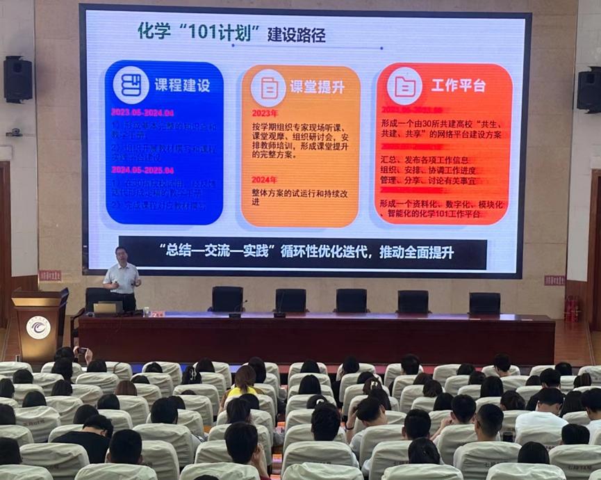 卢忠林解读了教育部基础学科“101计划”的内涵、建设目标、发力点及建设愿景。从有机化学课程建设的背景出发,在分享教学理念植入、教学课件优化、知识点梳理、思政案例展示、教学设计实施等方面的经验基础上,结合课程数字化教学资源建设经历,介绍了在一流课程建设、教学改革和教学实践等方面的具体做法、体会和思考。报告期间,卢教授就一流课程建设、双语教学和有机化学课程学习等问题与公司师生进行了深入交流研讨。
