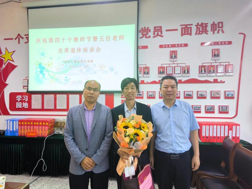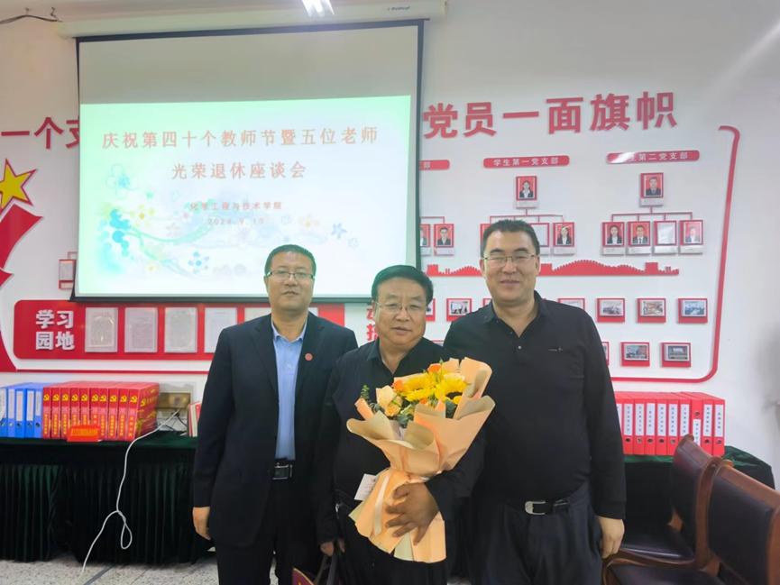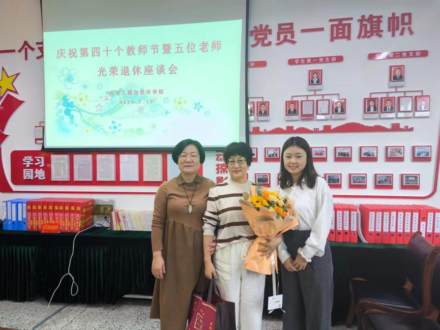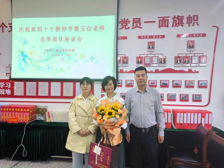 公司领导班子成员和青年教师代表向五位荣退老教师赠送纪念品并献上鲜花!