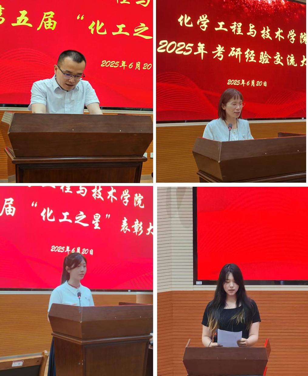 6月20日下午三点,公司在三号报告厅举行第五届“化工之星”表彰暨2025年考研经验交流大会。公司领导班子成员、第五届“化工之星”受表彰教师及学生、21级考研成功员工代表、辅导员、22级各班班主任及全体在校员工共计200余人参加大会。会议由公司党委副书记廖天录主持。